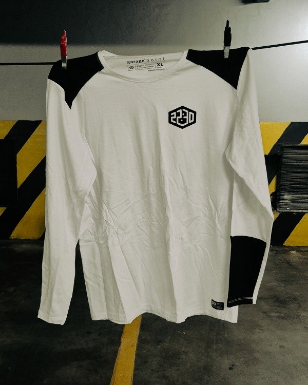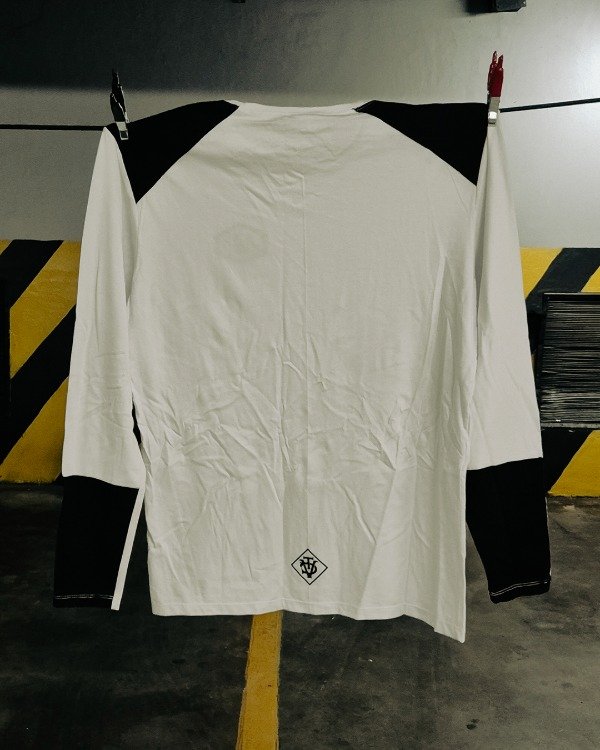 Remera de jersey 100% algodón peinado color blanco con detalles negros en hombro y puños. Logos en impresos en Flock.